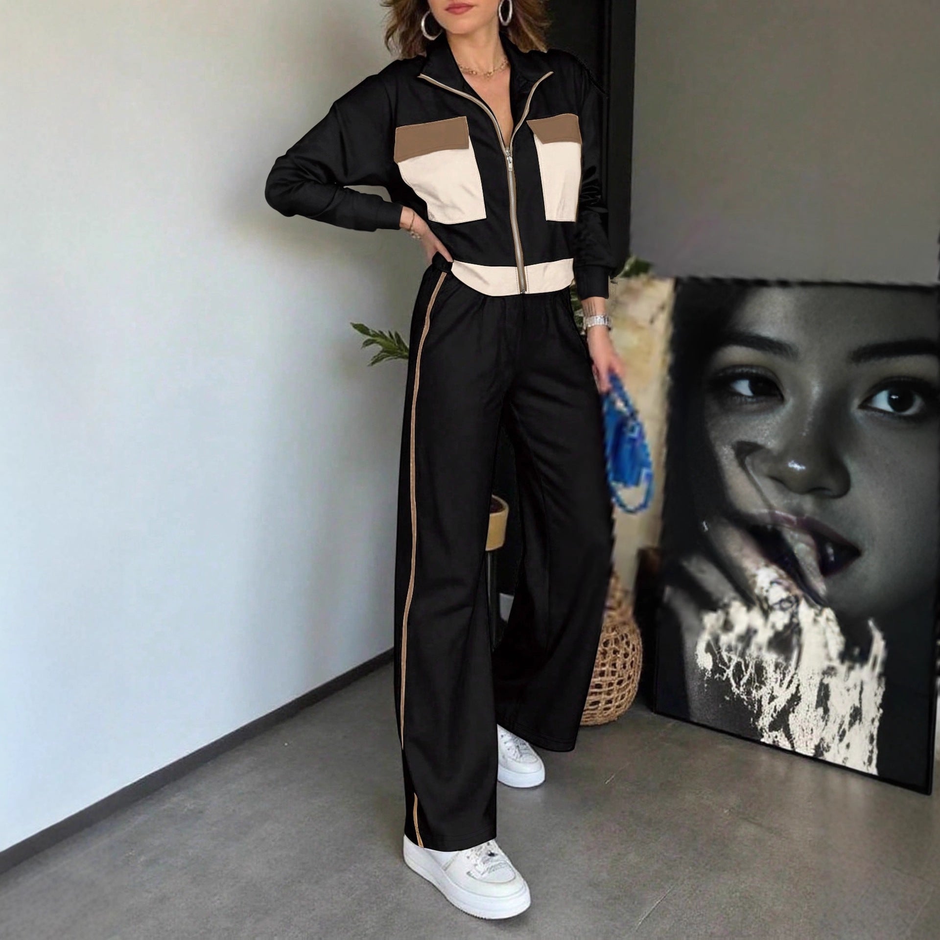 Conjunto de Dos Piezas para Mujer: Polera de Manga Larga en Combinación de Colores y Pantalones Rectos con Cintura Elástica