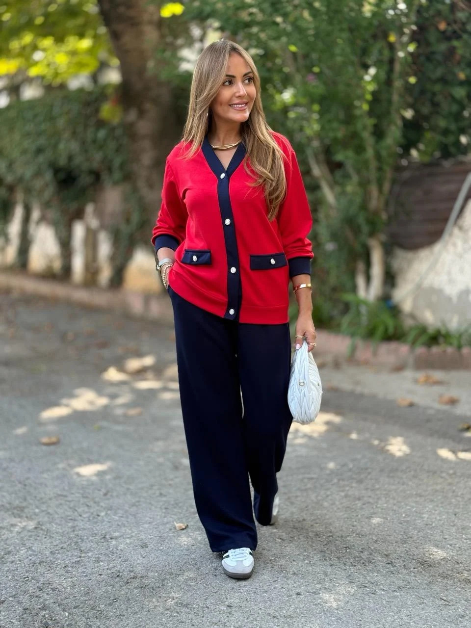 Cárdigan Tejido de Mujer con Contraste de Color y Cuello en V